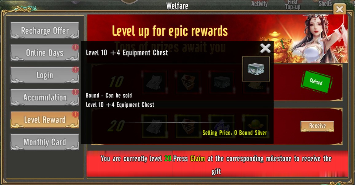 On the main game interface, players can click the "Benefits" button, then select "Rewards - Level" to access the reward claim interface.