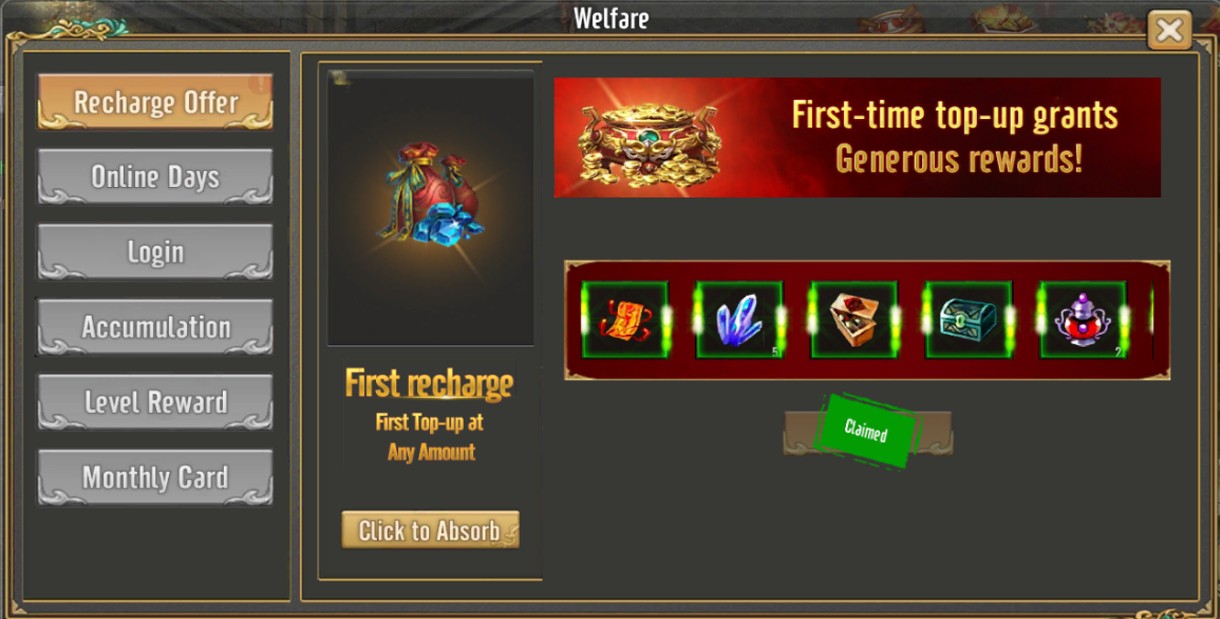 After a successful top-up, players can click the "First Top-Up Gift" button on the main game interface to access the reward area.