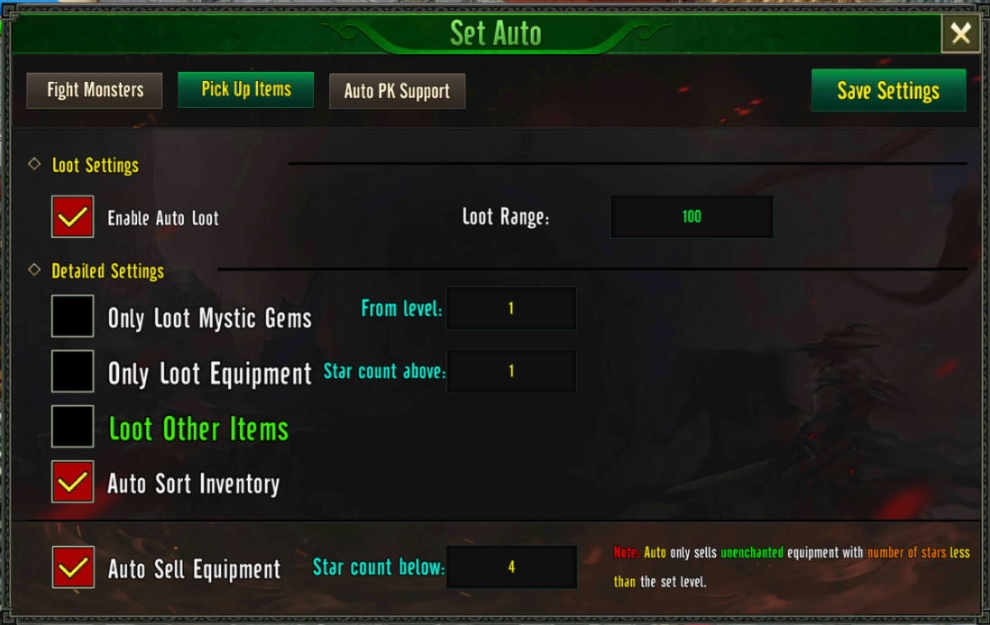 - Detailed Settings: Choose specific items for automatic pickup, as well as options for auto-sorting the inventory and selling unwanted equipment.