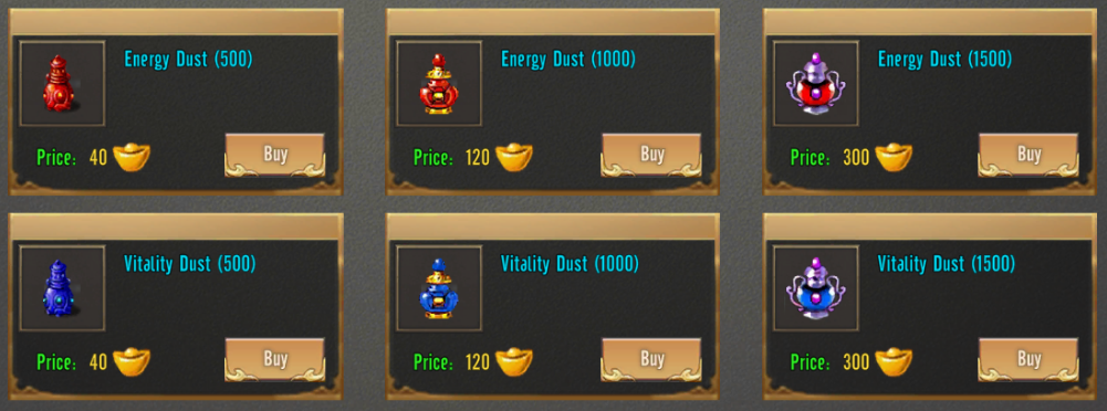 Defense Stone | Types of Five Elements Stone from level 1 to evel 10 | Types of [Diamond] from level 1 to level 10 | - Used to increase maximum Vitality for 60 minutes. - Also required to complete the Bao Wan Tong quest. |
