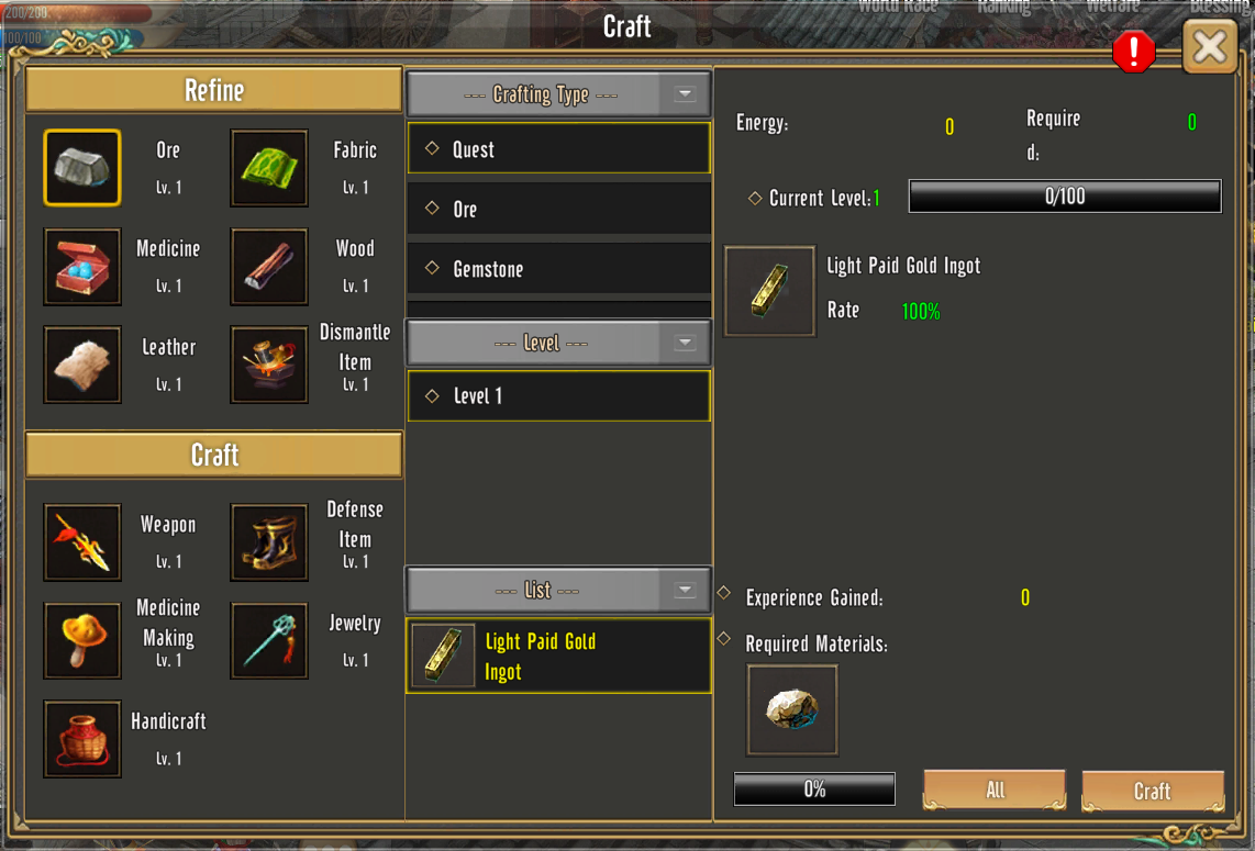 Paid Gold Ore [Level 1] Tin Ore [Level 2] Iron Ore [Level 3] Silver Ore [Level 4] Gold Ore [Level 5] Wu Gold Ore [Level 6] Purple Gold Ore [Level 7] Cold Iron Ore [Level 8] Mystic Iron Ore [Level 9] Refined Steel Ore [Level 10] |
