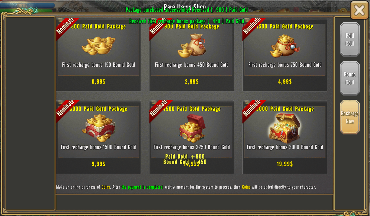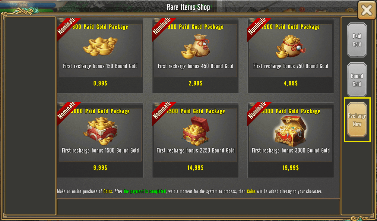 - Each top-up package will be given an additional 50% Bound Gold when you top-up for the first time.