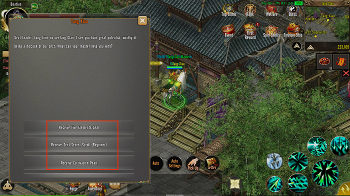 - Players select three slots in sequence to receive: Five Elements Seal, Sect Secret Manual, and Cultivation Pearl.