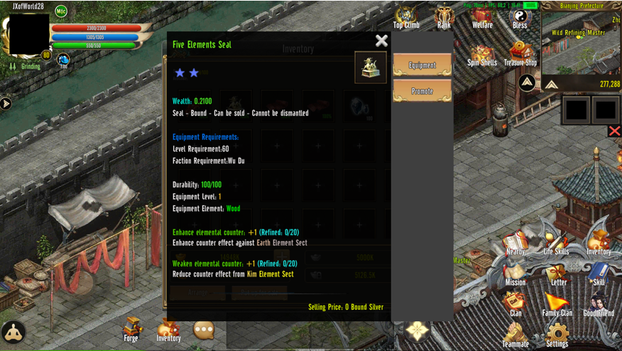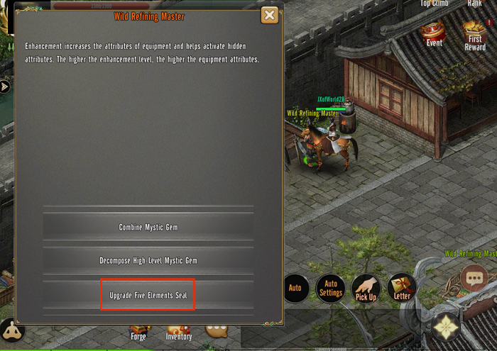 - Interact with the NPC Wild Refining Master in urban or the Village, then select "Upgrade Five Elements Seal" to open the upgrade interface - Coordinates: Bianjing - Note: The Five Elements Seal must be placed in the inventory to be upgraded. |