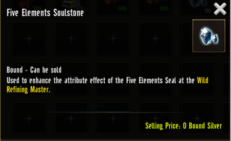 - Use the "Five Elements Soul Stone" item as material to upgrade the Five Elements Seal. - Five Elements Soul Stones can be purchased at the Shop.. |